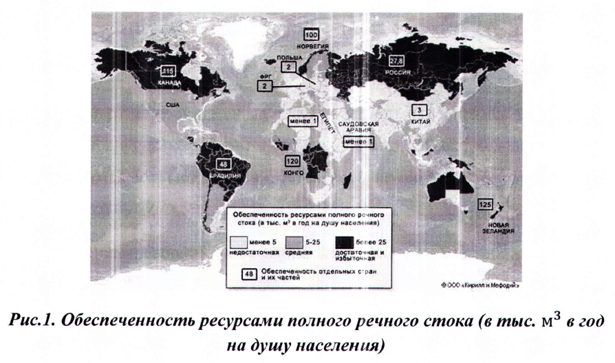 Водные ресурсы планеты. Земля обладает колоссальным объемом воды около 1,5 млрд. куб. км. Однако 98% этого объема составляют соленые воды Мирового океана, и только 28 млн. куб. км — пресные воды. Поскольку уже известны технологии опреснения соленых морских вод, воды Мирового океана и соленых озер можно рассматривать как потенциальные водные ресурсы, использование которых в будущем вполне возможно.